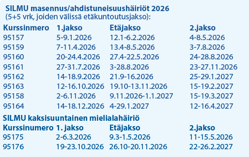 SILMU-kuntoutus on suunnattu sinulle yli 18-vuotias työssä oleva, sinne palaava tai olet kuntoutustuella tai opiskelemassa, ja sinulla on diagnosoitu lievä tai keskivaikeaa masennus/ahdistuneisuushäiriö tai kaksisuuntainen mielialahäiriö ja mielenterveyden häiriö heikentää työ-, opiskelu- tai toimintakykyäsi. Kuntoutuskurssi on kasvokkaisen kuntoutuksen (5+5 vrk) ja etäkuntoutuksen (8 viikkoa) yhdistelmä. Kuntoutus ei sovellu sinulle, jos sinulla on vaikea-asteinen mielenterveyden häiriö, esimerkiksi vaikea masennus, vakavia psyykkisiä oireita tai hoitamaton alkoholi- tai muu päihdeongelma.